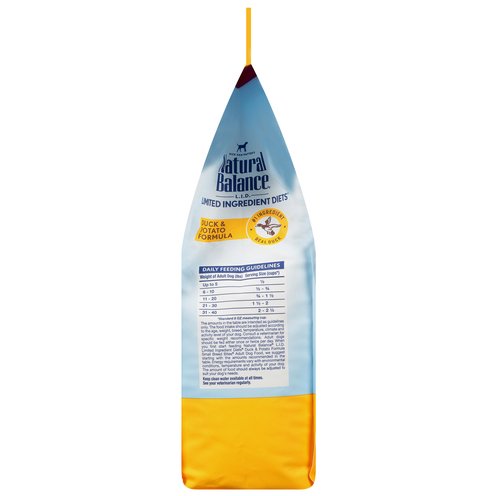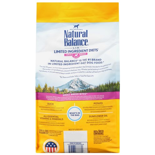 Calorie Content (calculated)(ME): 3431 kcal/kg, 375 kcal/cup Dick Van Patten's Natural Balance L.I.D. Limited Ingredient Diets Duck & Potato Formula Small Breed Bites Adult Dog Food is formulated to meet the nutritional levels established by the Association of American Feed Control Officials (AAFCO) Dog Food Nutrient Profiles for Adult Maintenance. Food for small breeds. Complete and balanced for adult dogs. No artificial flavors. Gluten-free. Grain free. Single animal protein source. No fillers. Helps support healthy digestion. Taurine to help support heart health. Skin & Coat Promise: Balanced omega-6 & omega-3 fatty acids along with high quality protein help support healthy skin & coat. What's in The Bag: Duck: Provides essential amino acids that help maintain strong muscles. Potato: Gluten-free source of carbohydrates, which makes it an excellent source of sustained energy. All Essential Vitamins & Minerals: Complete and balanced to help meet your adult dog's nutritional needs. Sunflower Oil: Rich in omega-6 fatty acids, it helps give your pet healthy skin and a soft, shiny coat. No artificial preservatives or colors. Dick Van Patten's L.I.D. Limited ingredient diets. No.1 ingredient real duck. Natural balance is the No. 1 brand in limited ingredient diet dog food (By share and dollar sales in total pet specialty). For over 15 years, we have been pioneering limited ingredient diet formulas intended to thoughtfully limit the number of ingredients you choose to feed your dog. Whether you're looking to avoid certain ingredients, or you just want to keep it simple, we have a trusted formula that will feed your dog's greatness. Small Breed Bites: Our small breed kibble is designed for smaller jaws and formulated to meet the unique nutritional needs of your small breed dog. Every bite is packed with flavor and rich in nutrients, and the crunchy texture helps promote clean teeth and healthy gums. 100% satisfaction guarantee. Produced in the USA with the worlds finest ingredients.