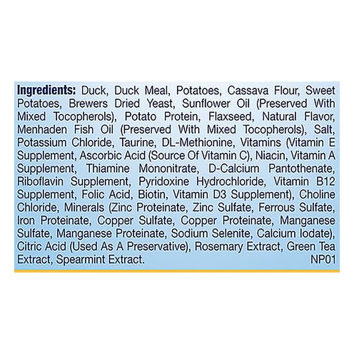 Duck, Duck Meal, Potatoes, Cassava Flour, Sweet Potatoes, Brewers Dried Yeast, Sunflower Oil (Preserved with Mixed Tocopherols), Potato Protein, Flaxseed, Natural Flavor, Menhaden Fish Oil (Preserved with Mixed Tocopherols), Salt, Potassium Chloride, Taurine, DL-Methionine, Vitamins (Vitamin E Supplement, Ascorbic Acid (Source of Vitamin C), Niacin, Vitamin A Supplement, Thiamine Mononitrate, D-Calcium Pantothenate, Riboflavin Supplement, Pyridoxine Hydrochloride, Vitamin B12 Supplement, Folic Acid, Biotin, Vitamin D3 Supplement), Choline Chloride, Minerals (Zinc Proteinate, Zinc Sulfate, Ferrous Sulfate, Iron Proteinate, Copper Sulfate, Copper Proteinate, Manganese Sulfate, Manganese Proteinate, Sodium Selenite, Calcium Iodate), Citric Acid (Used as a Preservative), Rosemary Extract, Green Tea Extract, Spearmint Extract.