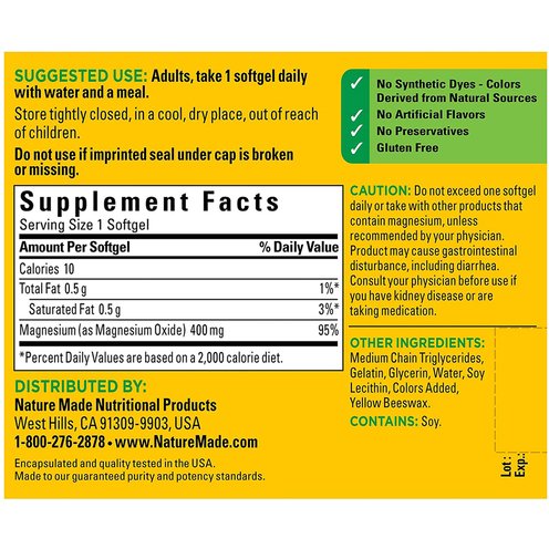 Nature Made® Extra Strength Magnesium can help people meet their individual magnesium requirements with one easy to swallow softgel. Made with colors derived from natural sources.
