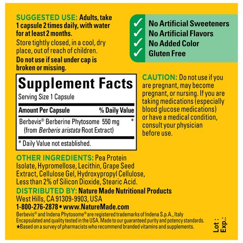 Nature Made Berberine Phytosome Capsules have better absorption and 5x higher bioavailability than standard Berberine (HCl). Clinically studied Berbevis Berberine Phytosome helps support healthy glucose levels and lipid metabolism. This Berberine supplement also helps support cardiovascular health. These Berberine capsules are gluten free with no artificial sweeteners, no artificial flavors and no added color.