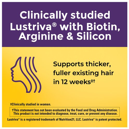 Nature Made Hair Growth Softgels with Lustriva and Vitamin A and Vitamin C provide a clinically studied ingredient to support thicker, fuller existing hair in 12 weeks(1). Lustriva hair growth supplement includes Biotin 10000mcg from Magnesium Biotinate, Arginine, Silicon and Inositol. In the clinical study, adult women had an increase in existing hair thickness in 12 weeks(1).