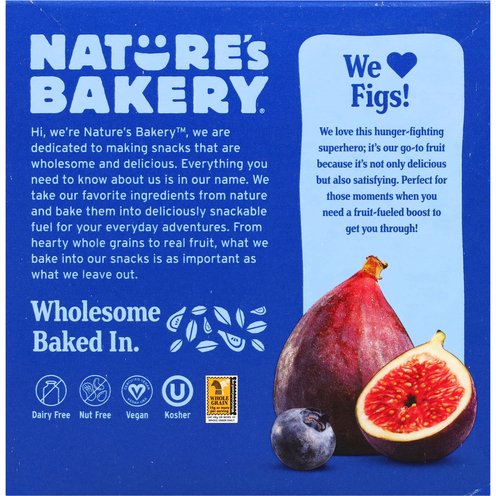 Whole grains & real fruit. 200 calories per pack. Certified vegan. Vegan.org. Whole Grains: 19 g or more per serving. Eat 48 g or more of whole grain daily. Dairy free. Nut free. Non-GMO Project verified. No high fructose corn syrup. Hi, we're Nature's Bakery, we are dedicated to making snacks that are wholesome and delicious. Everything you need to know about us is in our name. We take our favorite ingredients from nature and bake them into deliciously snackable fuel for your everyday adventures. From hearty whole grains to real fruit, what we bake into our snacks is as important as what we leave out. Wholesome baked in. We heart figs! We love this hunger-fighting superhero; ifs our go-to fruit because it's not only delicious but also satisfying. Perfect for those moments when you need a fruit-fueled boost to get you through!