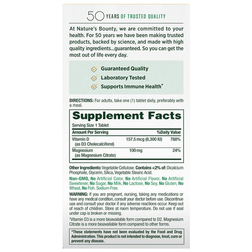 Support your immune health with Nature’s Bounty Advanced D3 + Magnesium Citrate Immune Formula. Containing a potent combination of Magnesium and Vitamin D, our innovative two-in-one formula utilizes the superior forms of each – Vitamin D3 and Magnesium Citrate – for better absorption and bioavailability. Magnesium assists with converting Vitamin D to its active form, which helps to support a healthy immune system. It is also an important bone health supplement, playing a key role in the body’s muscular reactions and cellular energy metabolism. Vitamin D supports immune health and is vital for neuromuscular health and function, bone health, and exercise recovery.