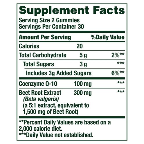 Nature’s Bounty® Beets & CoQ10 Gummies combine Beet Root Extract with the benefits of CoQ10 to support heart health and promote cellular energy production. Supports antioxidant health and plays a key role in cellular energy, cardiovascular function and circulation, while Beet Root Extract is popular for its naturally occurring nitrates. You’ll enjoy adding these convenient, delicious raspberry-flavored gummies to your wellness routine.
