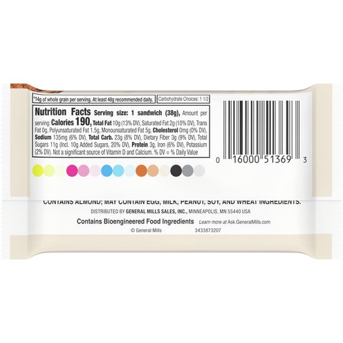Cinnamon biscuits with almond butter filling. 190 calories per pouch. 14 g of whole grain*. *14 g of whole grain per serving. At least 48 g recommended daily. Contains bioengineered food ingredients. . Carbohydrate Choices: 1-1/2.
