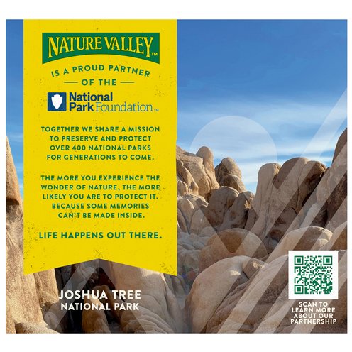 Almonds, raisins, peanuts & cranberries. No artificial flavors. Per Bar: 150 calories; 0.5 g sat fat (3% DV); 70 mg sodium (3% DV); 7 g total sugars. Contains bioengineered food ingredients. No artificial colors. No high fructose corn syrup. Nature Valley is a proud partner of the National Park Foundation. Together we share a mission to preserve and protect over 400 national parks for generations to come. The more you experience the wonder of nature, the more likely you are to protect it. Because some memories can't be made inside. Life happens out there. Joshua tree. National Park. Certified 100% recycled paperboard. Carbohydrate Choices: 2.