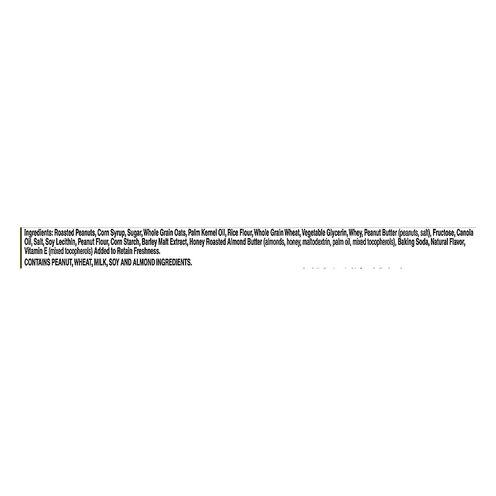 - Roasted Peanuts, Corn Syrup, Sugar, Whole Grain Oat, Palm Kernel Oil, Rice Flour, Whole Grain Wheat, Vegetable Glycerin, Whey, Peanut Butter (Peanuts, Salt), Fructose, Canola Oil, Salt, Soy Lecithin, Peanut Flour, Corn Starch, Barley Malt Extract, Honey Roasted Almond Butter (Almonds, Honey, Maltodextrin, Palm Oil, Mixed Tocopherols), Baking Soda, Natural Flavor, Vitamin E (Mixed Tocopherols) Added to Retain Freshness.