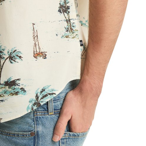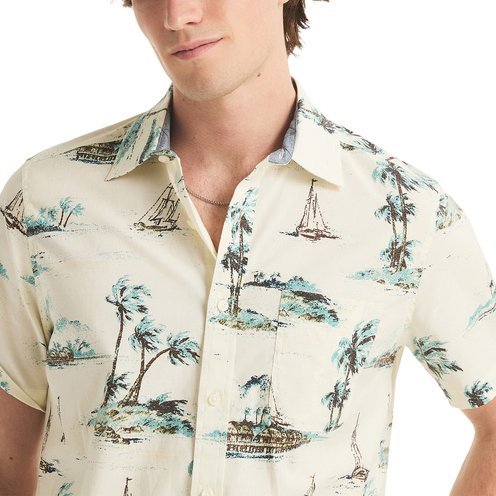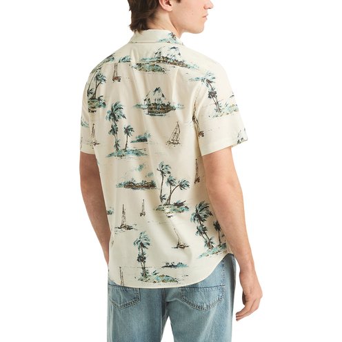 Made with a lightweight, naturally breathable linen-knit fabric that stays cool even in hot weather, this Sustainably Crafted short-sleeve shirt has a camp collar, tropical print, and our brand icon at the chest.