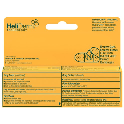 No. 1 doctor recommended brand. Triple antibiotic ointment. 24-hour infection protection. Effective germ kill formula. Neosporin original ointment with unique Heliderm technology provides a nourishing environment for skin (Formulated with a unique base of cocoa butter, cottonseed oil, olive oil, sodium pyruvate, vitamin E (tocopheryl acetate), and petrolatum). Every cut every time.