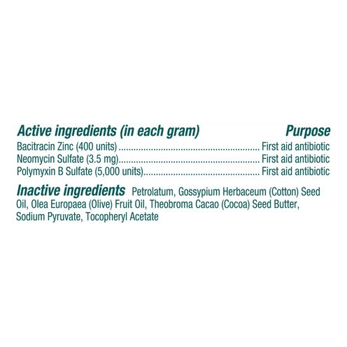 Active Ingredients: Bacitracin Zinc (400 units), First Aid Antibiotic; Neomycin Sulfate (3.5 mg), First Aid Antibiotic; Polymyxin B Sulfate (5000 units), First Aid Antibiotic.