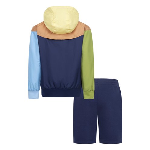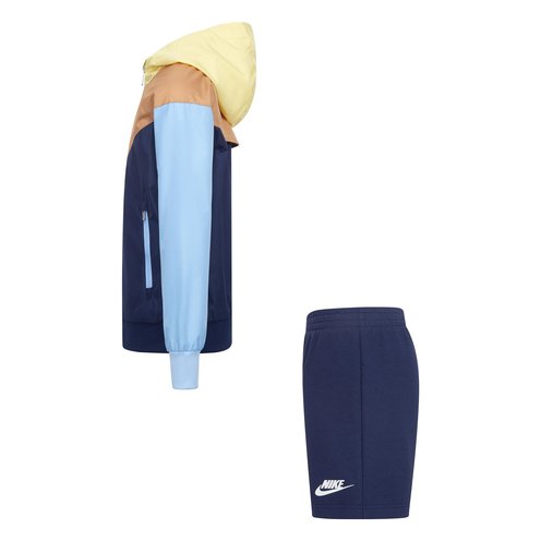 With this iconic set from Nike, kids can have fun and stay comfortable no matter the weather. This set includes a ripstop jacket with a water-resistant finish that offers a dry feel during the rain and matching French terry shorts with an elastic waistband.