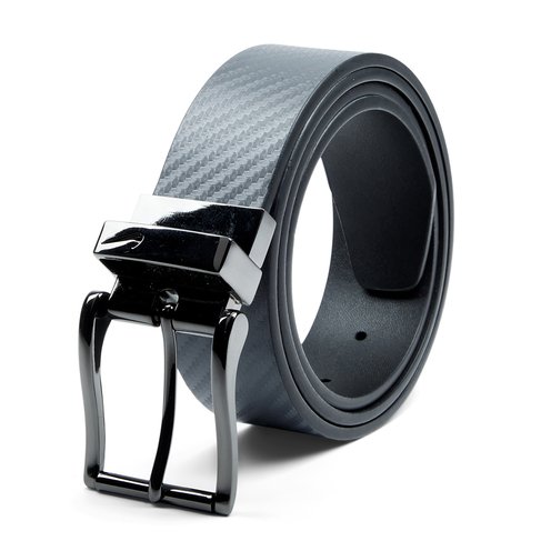 The Nike Carbon Fiber Reversible belt features a textured pattern on one side and a matte color on the reverse. The durable construction features a two-color design that is adaptable to go with any outfit, and the matte black buckle emanates timeless elegance. A Nike® Swoosh logo polishes off the buckle and perfectly fashions any ensemble from work to the clubhouse. Simply rotate the belt at the buckle base to change it up and diversify your wardrobe. Paired to perfection. There are no pants this men's Nike leather belt doesn't match thanks to its reversible styling.