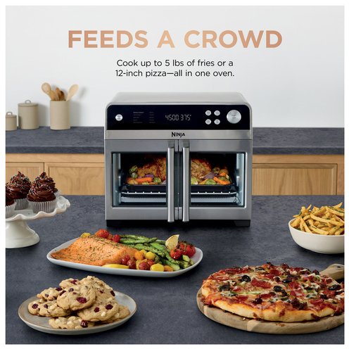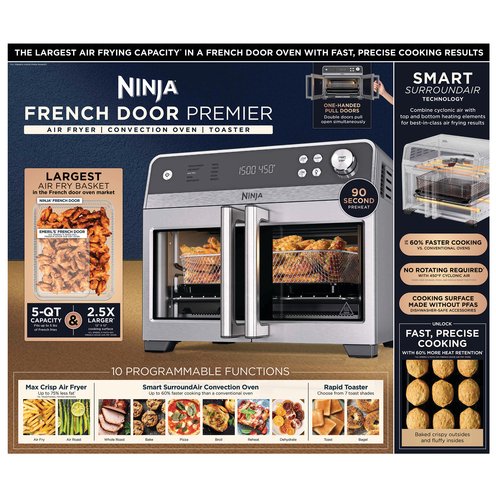 The Ninja® French Door Premier 10-in-1 Air Fryer, Convection Oven, and Toaster delivers the largest air fry capacity in a French door design, combining premium style with powerful performance. Using 450°F cyclonic air, it cooks up to 60% faster than conventional ovens and with up to 75% less fat than traditional frying, while ensuring crispy, even results-no rotating required. With 10 cooking functions for meals, snacks, and entertainment; included air basket and sheet pan that serve XL capacity; dishwasher-safe accessories; and a non-toxic cooking surface made without PFAS, this is the ultimate premium solution for family-sized cooking.