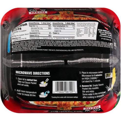 - Enriched Flour (Wheat Flour, Niacin, Reduced Iron, Thiamine Mononitrate, Riboflavin, Folic Acid), Vegetable Oil (Palm Oil, Canola Oil, Safflower Oil), Water, Sugar, Salt, Contains Less than 2% of Beef Fat, Beta Carotene Color, Caramel Color, Citric Acid, Corn Syrup, Dextrose, Disodium Guanylate, Disodium Inosinate, Dried Bok Choy,� Dried Carrot Flake, Dried Roasted Chili, Dried Shiitake Mushroom, Egg White, Garlic Powder, High Fructose Corn Syrup, Lactose, Maltodextrin, Natural Flavor, Potassium Chloride, Rice, Sodium Phosphate, Sodium Tripolyphosphate, Soy Lecithin, Soybean, Sucralose, TBHQ (Preservative), Vinegar, Wheat, Xanthan Gum.