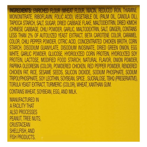 - Enriched Flour (Wheat Flour, Niacin, Reduced Iron, Thiamine Mononitrate, Riboflavin, Folic Acid), Vegetable Oil (Palm Oil, Canola Oil), Tapioca Starch, Salt, Sugar, Dried Cabbage Flake, Maltodextrin, Dried Kimchi (Chinese Cabbage, Chili Powder, Garlic, Maltodextrin, Salt, Ginger), Contains Less than 2% of Autolyzed Yeast Extract, Beta Carotene Color, Caramel Color, Chili Pepper Powder, Citric Acid, Concentrated Chicken Broth, Corn Starch, Disodium Guanylate, Disodium Inosinate, Dried Green Onion, Egg White, Garlic Powder, Glucose, Hydrolyzed Corn Protein, Hydrolyzed Soy Protein, Lactose, Modified Food Starch, Natural Flavor, Onion Powder, Paprika Oleoresin (Color), Powdered Chicken, Red Pepper Powder, Rendered Chicken Fat, Rice, Sesame Seeds, Silicon Dioxide, Sodium Phosphate, Sodium Tripolyphosphate, Soy Lecithin, Soybean, Spice, Sucralose, TBHQ (Preservative), Torula Yeast Extract, Turmeric (Color), Wheat, Xanthan Gum.