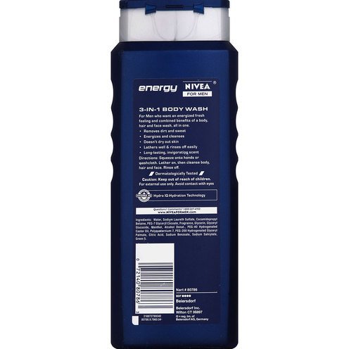 Body, hair & face. Energizes, with mint extract. Hydra IQ: Hydration technology. For Men who want an energized fresh feeling and combined benefits of a body, hair and face wash, all in one. Removes dirt and sweat. Energizes and cleanses. Doesn't dry out skin. Lathers well & rinses off easily. Long-lasting, invigorating scent. Dermatologically tested.