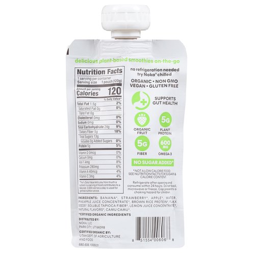 prebiotic fiber plant protein, flax & camu camu. 5 g plant protein. 5 g fiber. 600 mg omega-3. USDA Organic. Certified Organic by: Utah Dept. of Agriculture and Food. Vegan. Gluten free. No sugar added*. * Not a low calorie food. See nutrition facts for sugar & calorie content. Non-GMO Project verified. Delicious plant-based smoothies on-the-go. Support gut health.