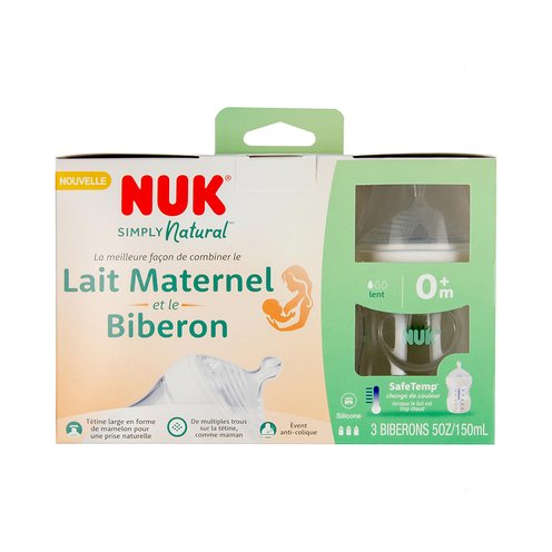 Now your baby can transition from breast to bottle in a natural way with the NUK® Simply Natural™ Bottles. Designed to mimic the fit, flow, and movement of mom as closely as possible, this is the only bottle with up to 9 nipple holes, just like mom. This provides a natural feeding experience to ensure the mom-baby bond remains strong. NUK® Simply Natural™ bottles feature a super-soft nipple that mimics the shape of mom's breast while breastfeeding. The scoop nipple cavity allows space for baby's tongue and jaw to move naturally, just like they do when breastfeeding. Now NUK® Simply Natural™ bottles feature SafeTemp technology, which lets you know when milk is too hot. The blue thermometer indicator fades when milk is too hot and reappears when milk has cooled and is safe to drink.