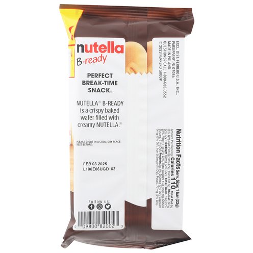 Crispy wafer filled with nutella hazelnut spread with cocoa. 110 calories per bar. New. x2. Perfect break-time snack. Nutella B-Ready is a crispy baked wafer filled with creamy Nutella. Love Nutella B-Ready? Be sure to try Nutella Hazelnut Spead with Breadsticks. Made in Poland.