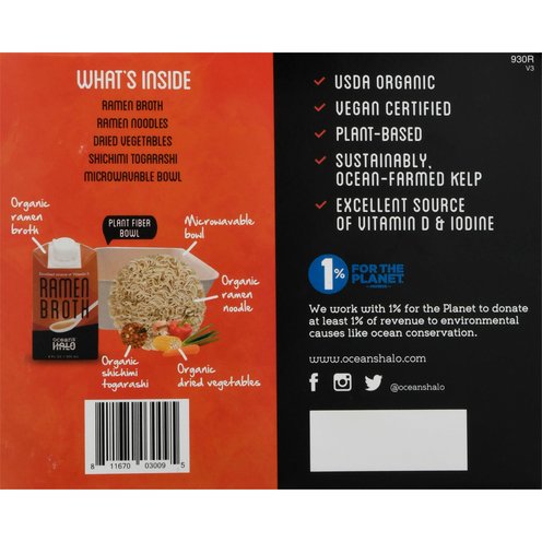 Organic ramen noodles and dried vegetables in our rich & creamy kelp-based broth. USDA Organic. Certified Organic by QAI San Diego, CA. Vegan certified. vegan.org. Excellent source of vitamin D. Excellent source of vitamin D & iodine. Ready in 4 mins. What's Inside: Ramen broth. Ramen noodles. Dried vegetables. Shichimi togarashi. Microwavable bowl. Organic ramen broth. Plant fiber bowl. Organic ramen noodle. Organic dried vegetable. Organic shichimi togarashi. Plant-based. Please recycle. Product of the USA.