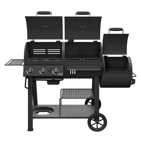 - COMBO SMOKER & GRILL: With a horizontal cooking chamber and a firebox on the side, the smoker is fueled by charcoal and flavored by hardwood splits & chunks, sold separately, to cook low and slow with indirect heat. The 3-burner gas grill is powered by liquid propane gas and runs on a 20-pound propane tank, not included. It has a 36,000 BTU rating, reaches cooking temperatures quickly, delivers high temps and maintains even heat.
