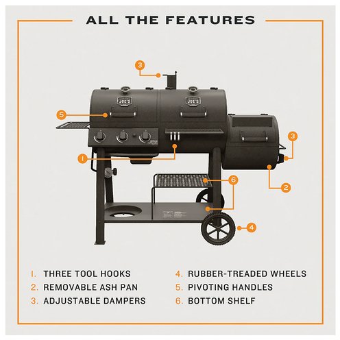 Redesigned to improve your smoking & grilling experience, the Canyon Combo now has pivoting cool touch handles, an easy-access ash pan and rubber treads on the wheels. There are tool hooks, a charcoal basket and a robust staging shelf.