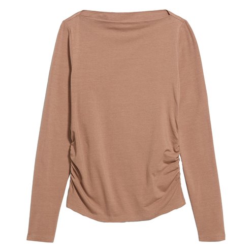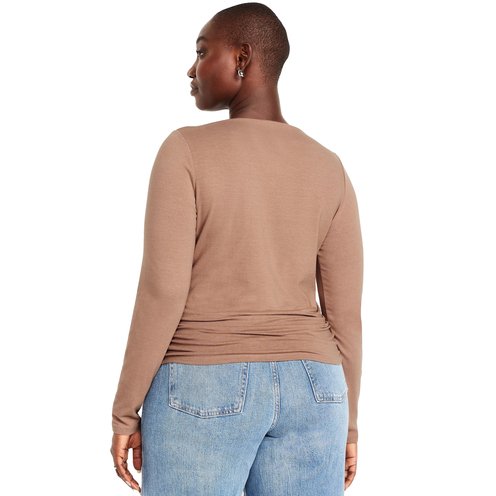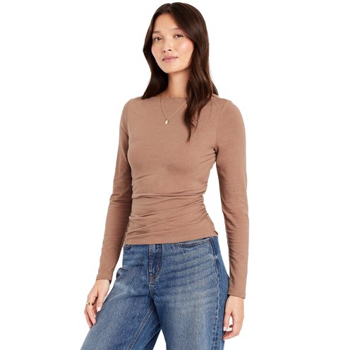 Elevate Your Wardrobe With This Stylish Long-Sleeve Top Featuring Classic Slit-Neck Detailing And Side Ruching For A Chic Touch