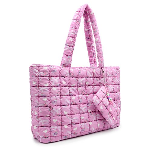 Where style meets versatility! From their extra cirriculars, to the gym, dance class and everywhere else! They'll be carrying it all in our newest quilted scrunchies tote bag in our light pink bow print. Detachable coin purse with beaded bag charm puller included.