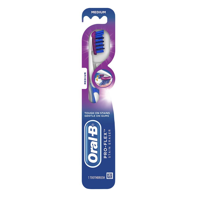 Toothbrush, Medium. Stain eraser. Tough on stains. Gentle on gums.