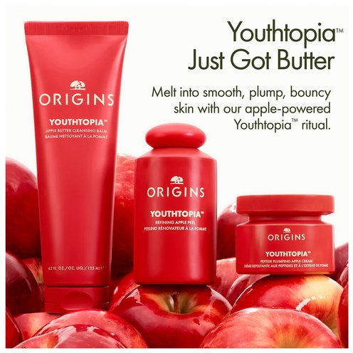 Origins Youthtopia™ Apple Butter Cleansing Balm is a buttery cleansing balm is made with omega-rich Apple Seed Oil and Shea Butter to help melt makeup and purify skin without drying or stripping.