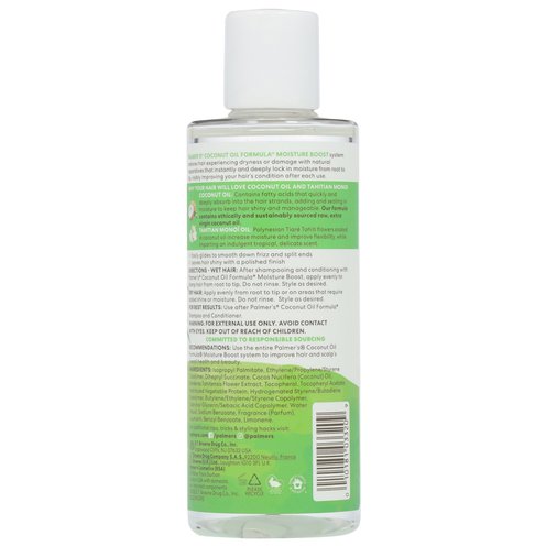 - Palmer's coconut oil formula moisture boost system restores hair experiencing dryness or damage with natural reparatives that instantly and deeply lock in moisture from root to tip, visibly improving your hair's condition after each use.