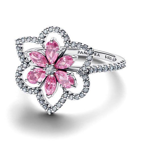 Bloom with elegance. Our sterling silver ring features a raised flower of pink marquise- and pear-shaped stones with clear accents and a half-pavé band. An elevated floral look to love.