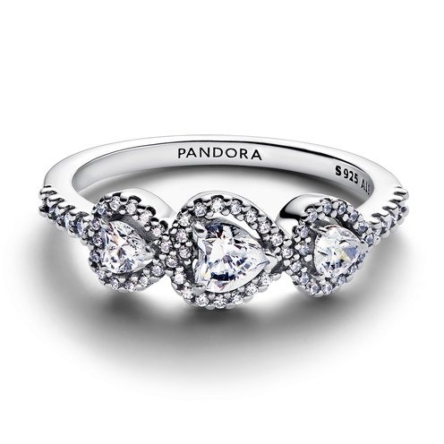 For the past, present and future. Crafted in sterling silver, this ring is set with three heart-shaped stones connected by a halo of pav�. A sparkling symbol of love in all its stages.