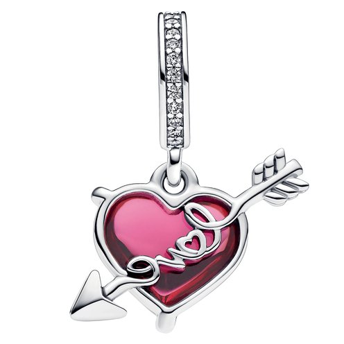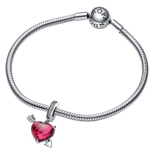 A charm for all the lovestruck hearts out there! The Red Heart & Arrow Murano Glass Dangle Charm features a red heart crafted from Murano glass, struck by a sterling silver Cupid’s arrow. The arrow spells out the word "love" through the glass, with the "o" forming a heart shape for a playful touch. A row of clear cubic zirconia pavé adds sparkle to the bail. Gift it as a fun and sweet gesture of love for the one who has your heart.