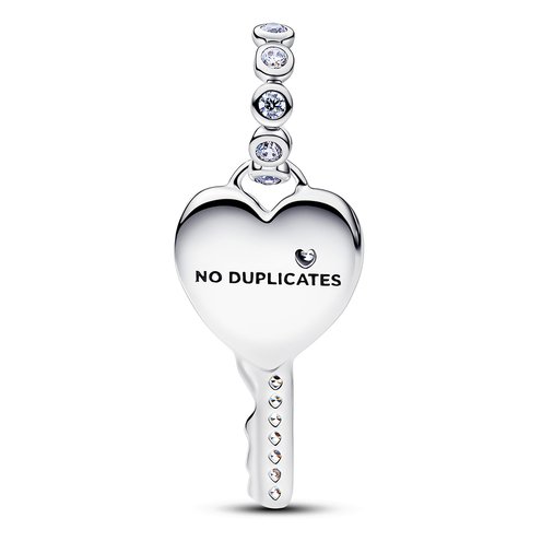 One heart, one key. This sterling silver heart key charm features a pink lab-created opal, sparkling cubic zirconia, and the engraving "NO DUPLICATES" for a love that's one of a kind.