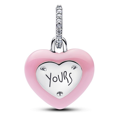 Keep love under lock and key. This sterling silver dangle features a pink ceramic heart with clear cubic zirconia, a keyhole-shaped stone, and an engraved disc reading"YOURS."