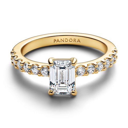 Cut to perfection. Crafted in 14k gold-plating, this ring features a raised clear stone with a half-pavé band. The perfect piece to dress up any fit.
