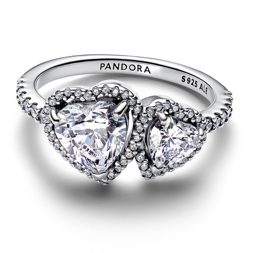 An eye-catching statement of love. This ring showcases two heart-cut stones, one clear cubic zirconia and one vibrant red man-made crystal, connected by a halo of shimmering pavé. Crafted in sterling silver, the top half of the band is adorned with more sparkling stones, creating a radiant effect. Pair it with other sterling silver rings for a love-filled stack, or let it shine as a standalone statement. Inspired by the love that connects us, the two hearts symbolise harmony and unwavering support between two souls.