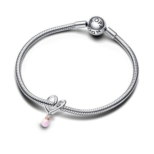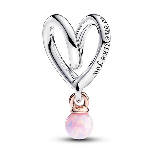 Crafted in sterling silver and plated with 14k rose gold, the Two-tone Wrapped Heart Charm is a unique piece for your mom's collection. Meticulously designed to wrap around any charm carrier, this charm features a captivating motif—a heart formed by looping sterling silver lines. Two engravings, "There is no one like you" and "mom," add a loving touch, where the "u" in mom is shaped as a heart. A dangling 14k rose gold-plated pin showcases a round pink lab-created opal, representing the beauty of motherhood. Embrace the completeness of maternal love with this exquisite Pandora heart charm.