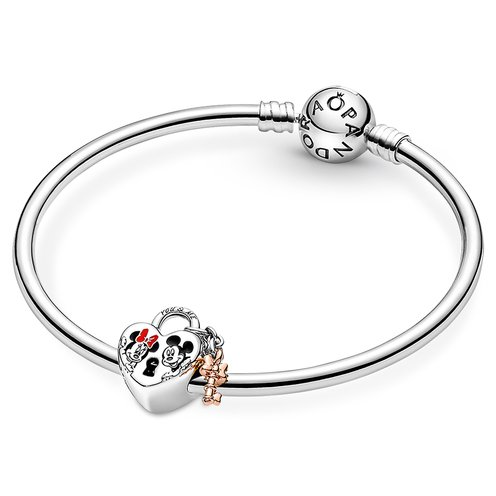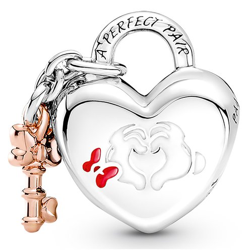This Disney Mickey Mouse & Minnie Mouse Padlock Charm is a celebration of everlasting love, featuring one of the world's most beloved couples. The adorable dangle charm is hand-finished in sterling silver, in the shape of a padlock, decorated with Disney's Mickey and Minnie Mouse and completed with a 14k gold-plated key. An engraving of "You & Me" is written across the top of the lock, making this Disney x Pandora charm a special jewelry gift for a loved one, or to yourself, to show how much you care.