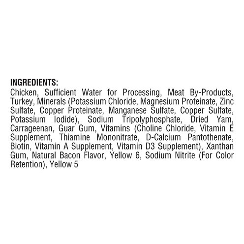 Chicken, Sufficient Water for Processing, Meat By-Products, Turkey, Minerals (Potassium Chloride, Magnesium Proteinate, Zinc Sulfate, Copper Proteinate, Manganese Sulfate, Copper Sulfate, Potassium Iodide), Sodium Tripolyphosphate, Dried Yam, Carrageenan, Guar Gum, Vitamins (Choline Chloride, Vitamin E Supplement, Thiamine Mononitrate, D-Calcium Pantothenate, Biotin, Vitamin A Supplement, Vitamin D3 Supplement), Xanthan Gum, Natural Bacon Flavor, Yellow 6, Sodium Nitrite (for Color Retention), Yellow 5.