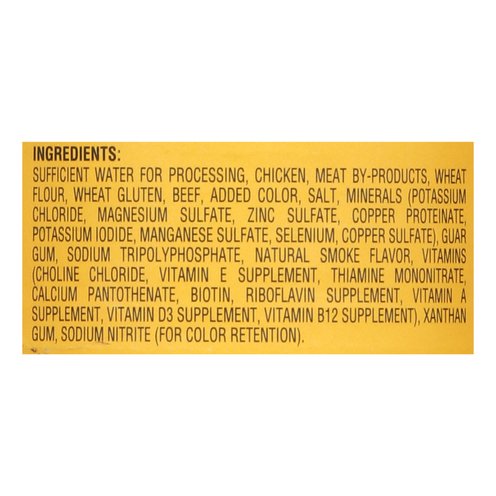 Sufficient Water for Processing, Chicken, Meat By-Products, Wheat Flour, Wheat Gluten, Beef, Added Color, Salt, Minerals (Potassium Chloride, Magnesium Sulfate, Zinc Sulfate, Copper Proteinate, Potassium Iodide, Manganese Sulfate, Selenium, Copper Sulfate) Guar Gum, Sodium Tripolyphosphate, Natural Smoke Flavor, Vitamins (Choline Chloride, Vitamin E Supplement, Thiamine Mononitrate, Calcium Pantothenate, Biotin, Riboflavin Supplement, Vitamin A Supplement, Vitamin D3 Supplement, Vitamin B12 Supplement), Xanthan Gum, Sodium Nitrite (for Color Retention).