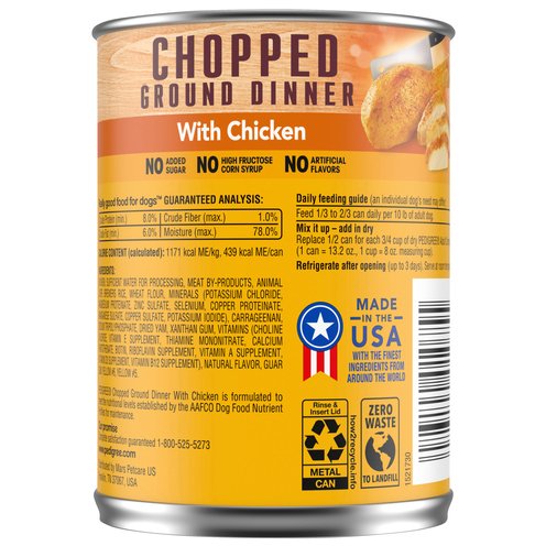 Serve at room temperature. Daily Feeding Guide (An individual dog's needs may differ): Feed 1/3 to 2/3 can daily per 10 lb of adult dog. Mix it up - add in dry: Replace 1/2 can for each 2/3 cup of dry Pedigree adult complete nutrition (1 can = 13.2 oz, 1 cup = 8 oz. Measuring cup).