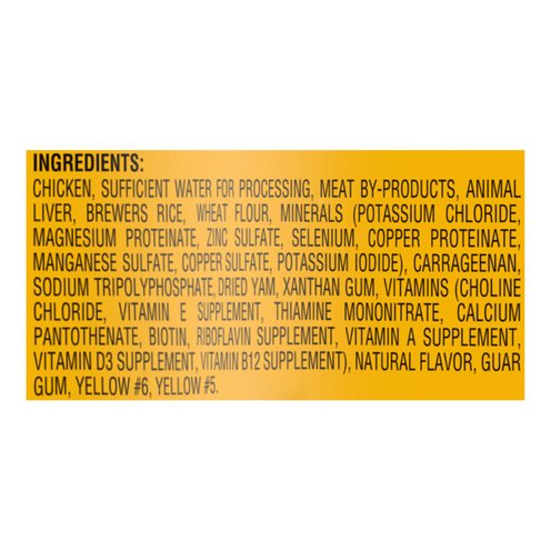 Chicken, Sufficient Water for Processing, Meat By-Products, Animal Liver, Brewers Rice, Beef, Wheat Flour, Minerals (Potassium Chloride, Magnesium Proteinate, Zinc Sulfate, Selenium, Copper Proteinate, Manganese Sulfate, Copper Sulfate, Potassium Iodide), Added Color, Carrageenan, Sodium Tripolyphosphate, Dried Yam, Natural Smoke Flavor, Xanthan Gum, Vitamins (Choline Chloride, Vitamin E Supplement, Thiamine Mononitrate, Calcium Pantothenate, Biotin, Riboflavin Supplement, Vitamin A Supplement, Vitamin D3 Supplement, Vitamin B12 Supplement), Guar Gum, Red 3.