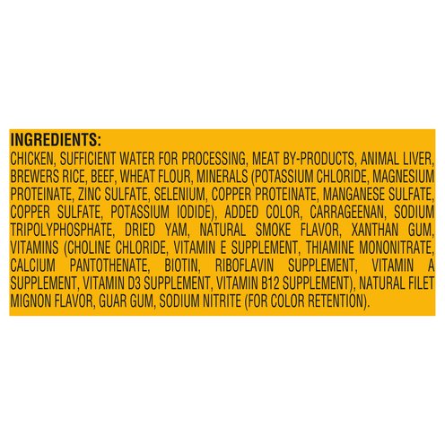 Chicken, Sufficient Water for Processing, Meat By-Products, Animal Liver, Brewers Rice, Beef, Wheat Flour, Minerals (Potassium Chloride, Magnesium Proteinate, Zinc Sulfate, Selenium, Copper Proteinate, Manganese Sulfate, Copper Sulfate, Potassium Iodide), Added Color, Carrageenan, Sodium Tripolyphosphate, Dried Yam, Natural Smoke Flavor, Xanthan Gum, Vitamins (Choline Chloride, Vitamin E Supplement, Thiamine Mononitrate, Calcium Pantothenate, Biotin, Riboflavin Supplement, Vitamin A Supplement, Vitamin D3 Supplement, Vitamin B12 Supplement), Natural Filet Mignon Flavor, Guar Gum, Sodium Nitrite (for Color Retention).