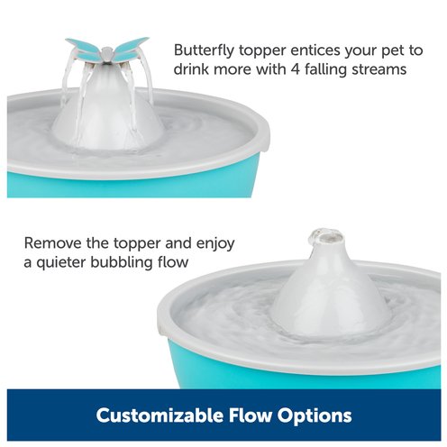 Multiple Stream Options - A decorative butterfly topper creates 4 free-falling water streams for your furry pal to drink from; the topper can be removed to provide a quiet, bubbling flow.