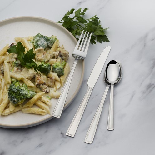 This Pfaltzgraff everyday Selby 34 piece set includes: 8 Dinner forks, 8 Dinner Knives, 4 Dinner Spoons, 8 teaspoons, 1 Serving Fork, and 1 Serving Spoon.
