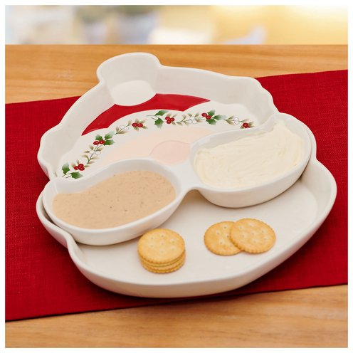 As fall turns to winter, bright holly berries make their appearance. Winterberry dinnerware by Pfaltzgraff is the holiday classic that brings this timeless motif to life in elegantly sculpted dinnerware and serveware, beautiful glassware, and joyous giftware. Made of high-quality dolomite for strength and durability, this delightful platter with dip bowl in vibrant Christmas colors features an adorable Santa face and a festive Winterberry accent. The smart design provides compartments for chips or finger foods and two different dips in the mustache, which is removable so it can be used separately to maximize serving space on the tray. Measures 2 inches high by 12 inches long by 14-1/2 inches wide. Hand-wash only to extended the life of the product.