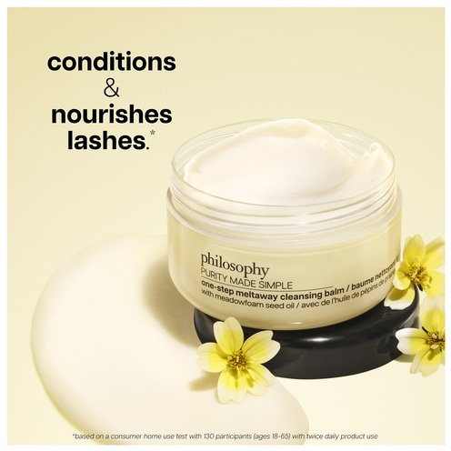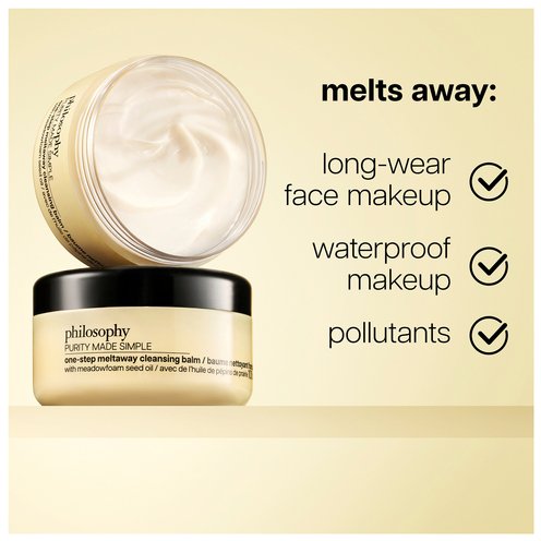 The philosophy Purity Made Simple One-Step Meltaway Cleansing Balm melts away long-wearing makeup, waterproof mascara, daily buildup, and pollutants — in one gentle step.