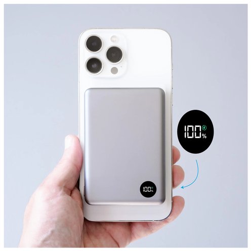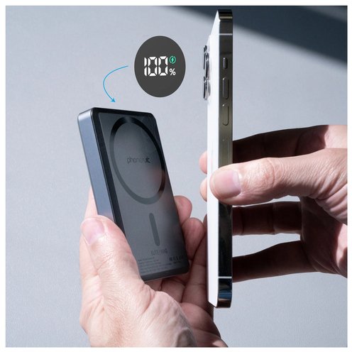 The PhoneSuit Elite Mag Slim | Magnetic Wireless Pocket Charger is 3-in-1 with a high definition LCD screen | Portable iPhone Charger, Charge Pad & Universal Power Bank. It's a compact & portable Wireless Battery Pack for your iPhone that securely connects with Apple MagSafe compatible Magnets. Simply place the Elite on your iPhone for immediate wireless power anytime you need it. Ultra-strong neodymium magnets keep it attached firmly to the back of your iPhone. The integrated 10,000 mAh battery cell can deliver up to 200% iPhone charge.